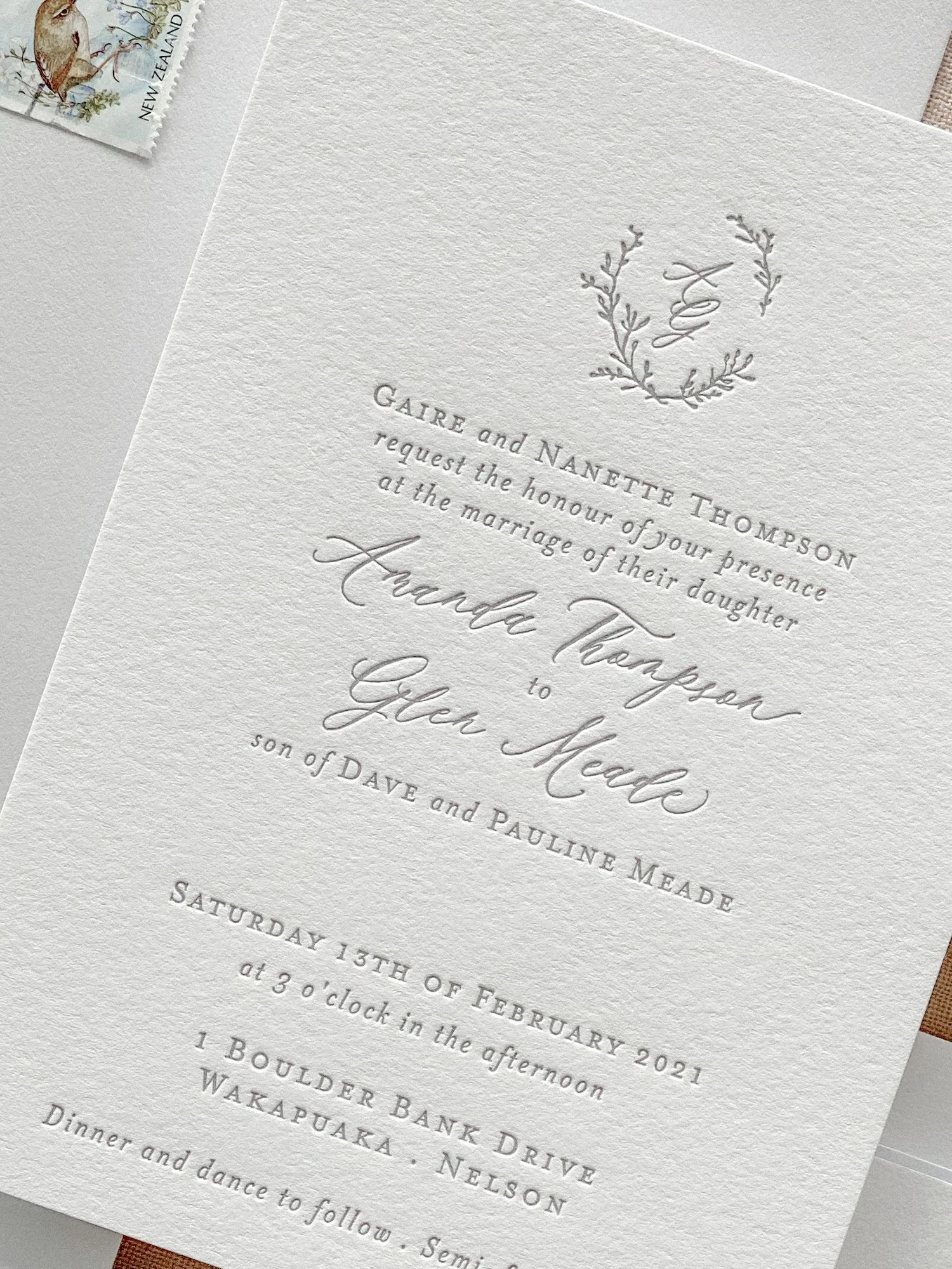 This wedding suite is a lovely example of how the Semi-custom collection can be customised to reflect the style and colours of your wedding day while adding in some custom items. Amanda and Glen chose the Monogram suite letterpress printed on 100% cotton paper with smoke ink and included cool grey envelopes, a beautiful soft romantic colour pallet that tied in with their florals and overall aesthetic. We changed the format of the details card to double-sided to accomodate all of the information their guests needed. With their monogram blind letterpressed on the front and assembled with fine paper twine it created a lovely introduction to their wedding when the recipients opened the envelopes. The wedding day items included menus that were blind letterpressed with their monogram and digitally printed. This allowed them to include a small quantity of vegetarian menus along with their standard menu. The place cards also included a blink letterpressed monogram plus digitally printed names. We also created a few custom items based on the style of the invitations and utilising some of the letterpress printing plates we already had for the wedding suite. Sweet little labels were attached to small honey pots that sat on the tables for each guest. The thank you postcards were the final touch and a lovely way to thank everyone who helped make their day so special.
